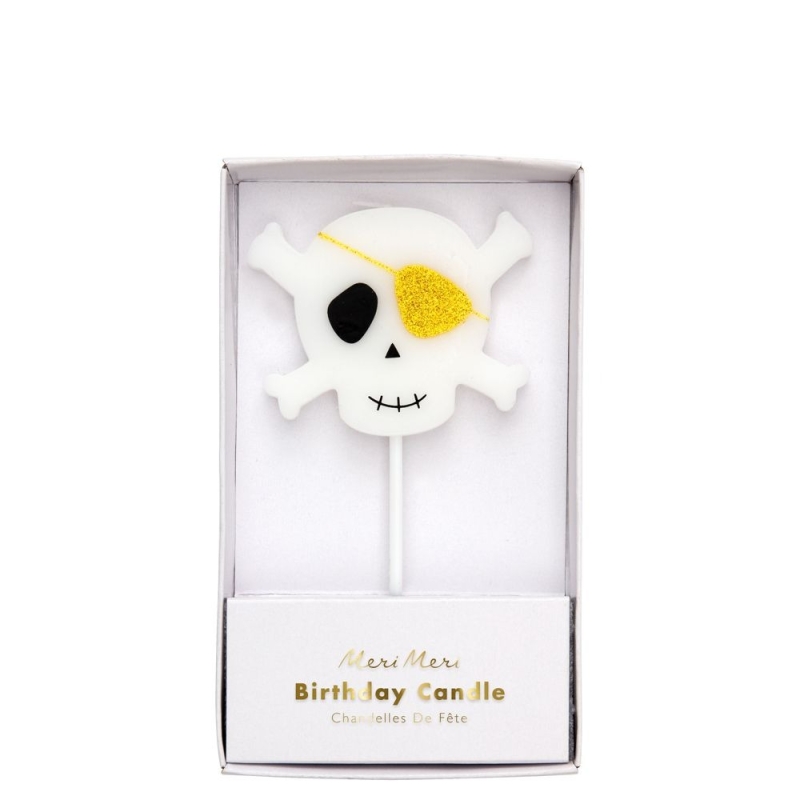Vous aimerez la bougie anniversaire pirate pour ses détails soignés et originaux comme le cache-oeil doré et pailleté tellement mignon.
