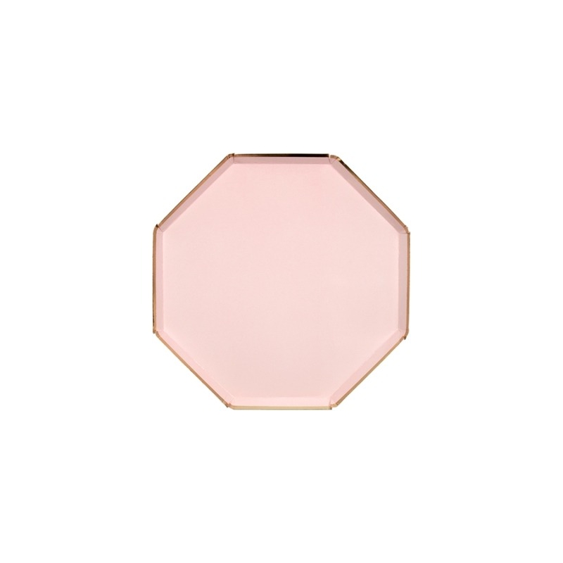 Leur coloris parfait, rose tendre, mettra en valeur votre table de fête. Ces assiettes jetables design sortent vraiment du lot avec leur forme octogonale et leur liseré en aluminium doré qui les rend si festives et élégantes.