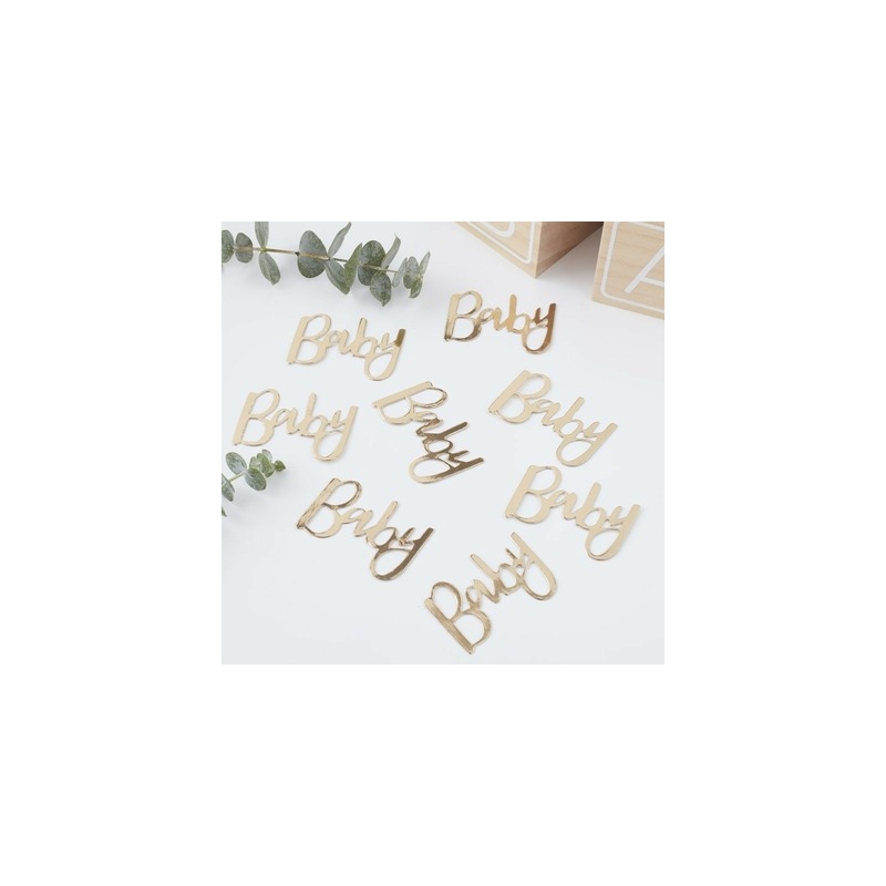 Des confettis baby en papier brillant doré pour compléter une décoration de baby shower chic, une déco de baptême dans les tons blanc et or ou un 1er anniversaire.